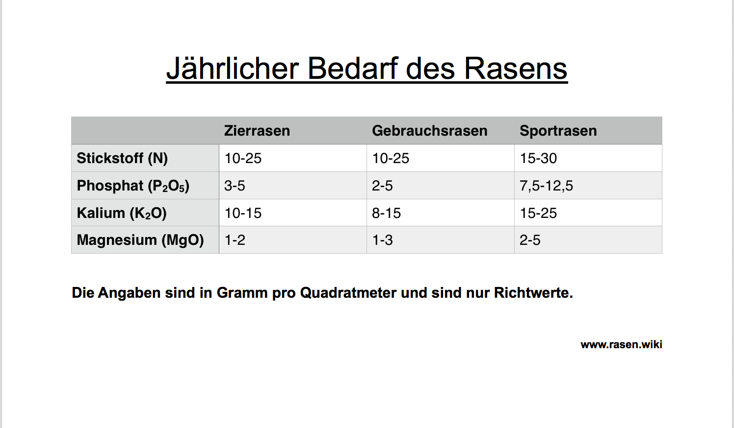 Die Tabelle zeigt die durchschnittlich verwendete Düngermenge pro Quadratmeter. Diese sollte grob eingehalten werden, damit der Rasen die nötigen Nährstoffe zugeführt bekommt. Der Bedarf wird in drei Düngungen aufgeteilt. Eine Düngung im Frühjahr, eine im Sommer, eine im Herbst.